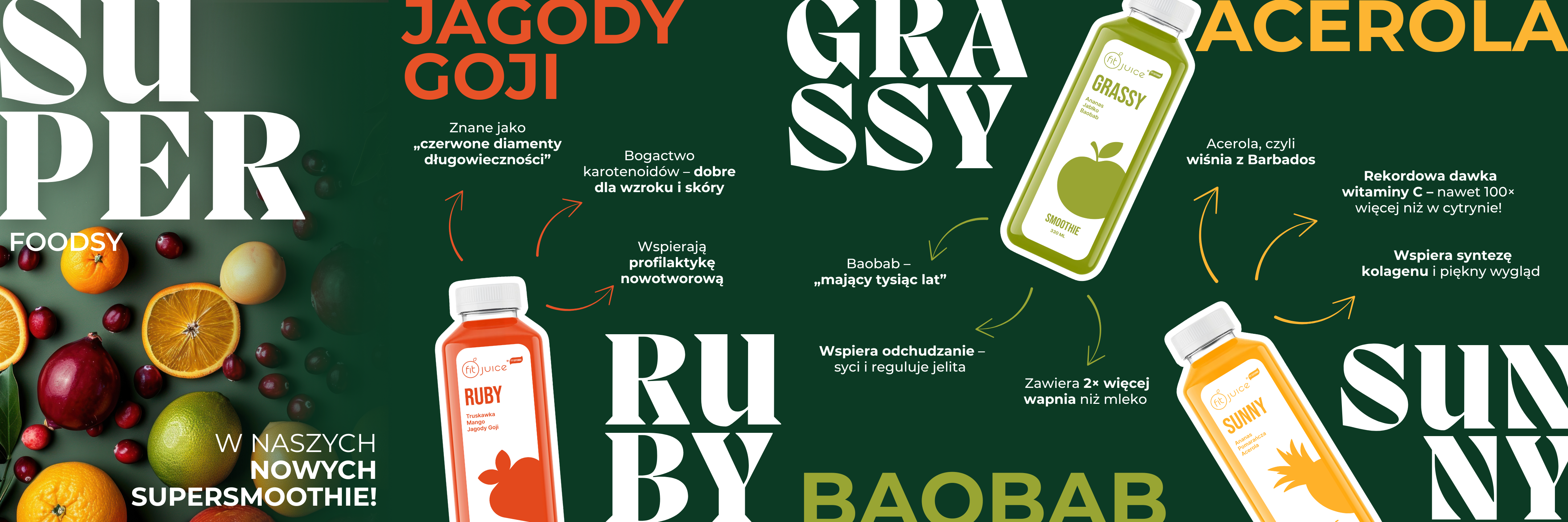 Nasze trzy nowe Supersmoothie – RUBY, GRASSY i SUNNY – to propozycje dla każdego, kto chce w prosty sposób dostarczyć organizmowi tego, co najlepsze. Każda butelka to starannie dobrana mieszanka owoców i superfoodsów, które wspierają zdrowie, wygląd i energię, a przy tym smakują jak najlepszy owocowy deser. To rozwiązanie stworzone z myślą o codziennym życiu – możesz zabrać je ze sobą do pracy, na siłownię, w podróż albo po prostu wypić w domu, gdy masz ochotę na coś pysznego i wartościowego.